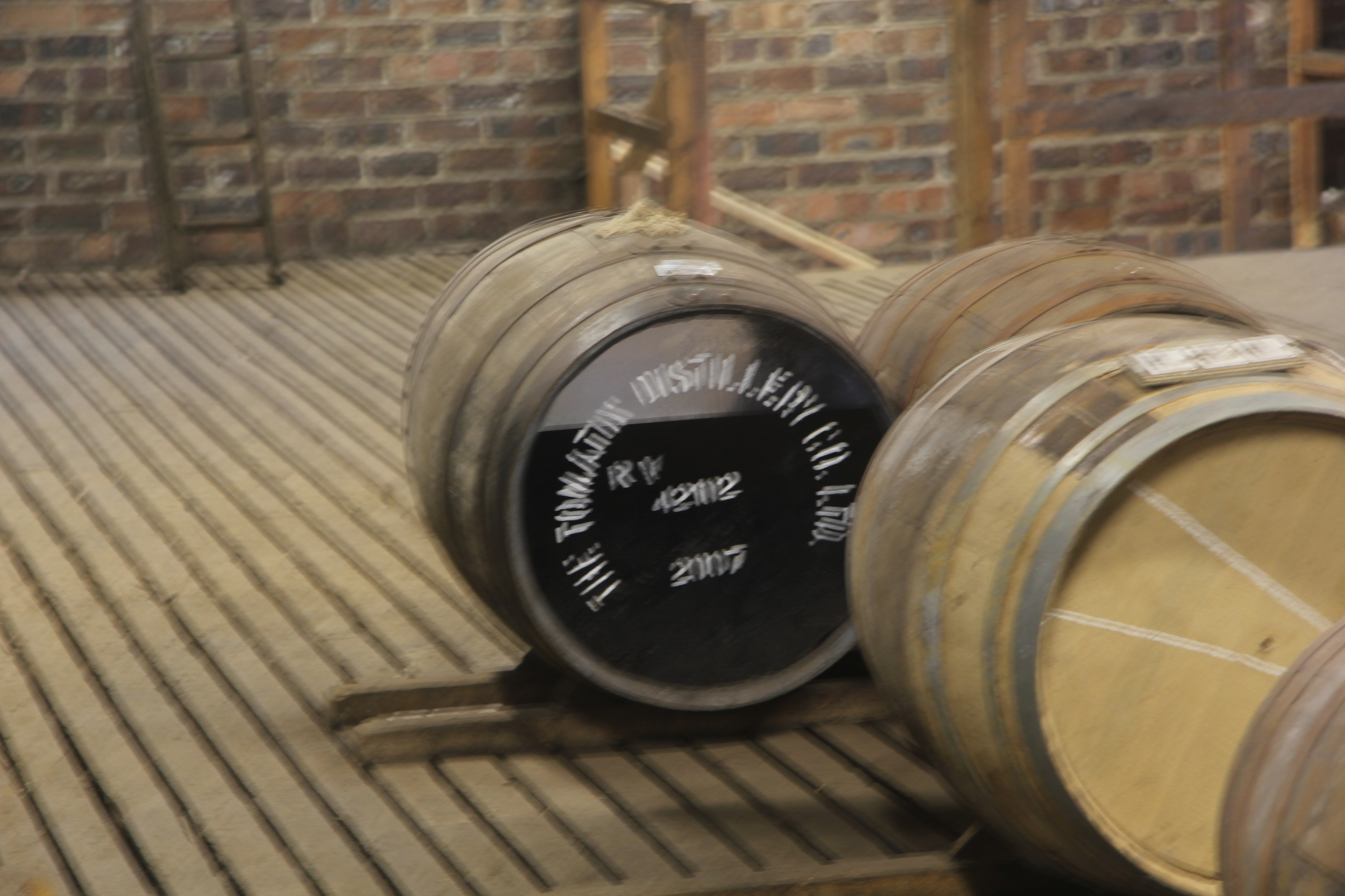 Etter noen år til lagring er volumet av whisky tydelig redusert som vises på dette fatet hos Tomatin. (Foto: Terje Pettersen-Dahl, 6/5 2024).